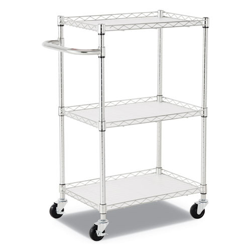 Three adjustable shelves with pull handle. Includes three shelf liners, four 35" poles and four casters (two locking). Shelves adjust in 1" increments. Includes three shelf liners and four casters (two locking) for mobility. 500 lbs. total weight capacity on casters. Easy to assemble -- no tools required.Package Includes: (4) Posts; (4) 3" Casters; (3) Polypropylene Liners