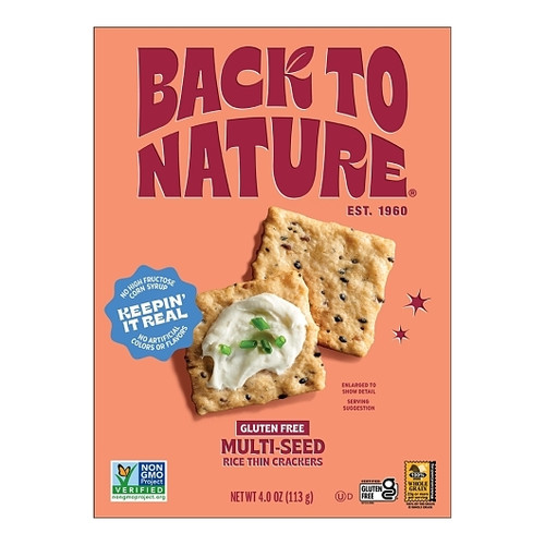 Enjoy a deliciously light and crispy snack with Back to Nature Multiseed Thin Rice Crackers. These gluten-free crackers are made with wholesome ingredients like whole grain brown rice and a blend of sesame, flax, and chia seeds. With a savory crunch and no artificial preservatives or flavors, they re perfect for snacking on their own, pairing with cheese, or dipping into your favorite spreads.