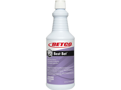The Betco Best Bet liquid abrasive creme cleanser quickly removes embedded rust, soap scum, stains, grease, oxidation, hard water minerals, and filth from a variety of surfaces. This product contains jewelry-grade abrasive that won't scratch surfaces like scouring powders. This stable white emulsion contains bleaching compounds, detergents, and wetting agents.