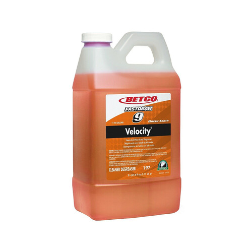 Betco Green Earth Velocity neutral cleaner to rival the power of an alkaline, butyl degreaser. A synergistic blend of propylene-based solvents combined with state-of-the-art surfactants produces a combination that will make traditional hard surface cleaners obsolete. This versatile, dilutable dynamo quickly and effectively removes inks, oils, greases, and fats from a variety of surfaces.