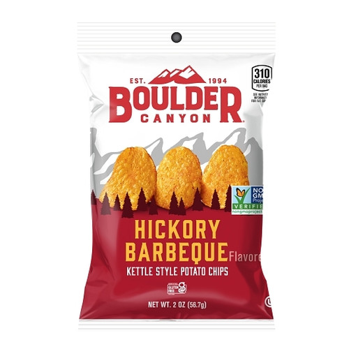 Boulder Canyon Hickory Barbeque Kettle Cooked Potato Chips - 2 oz. bag, 8 per case Boulder Canyon Hickory Barbeque Potato Chips deliver a sweet, smoked flavor that takes you back to your favorite outdoor barbeque. These rugged, rich and tangy chips feature a robust combination of hickory flavor, garlic and onion in an all natural snack. All Natural, Gluten Free, Zero Trans Fat, Zero Cholesterol.