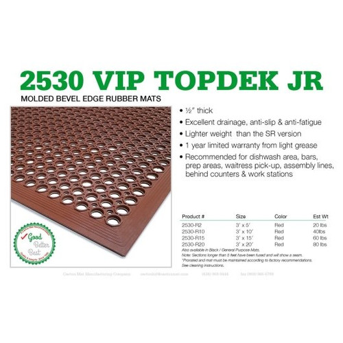 Our newest addition to the VIP family of mats, VIP-TOPDEK JUNIOR offers exceptional value, and incorporates many of the same features found in our other quality mats. - Apprx 1/2 thick rubber - Molded bevel edge on all sides for easy cart access. - Anti-slip surface for a safer work area. - Anti-fatigue for worker comfort and improved productivity. - Lightweight for ease of handling. - Excellent drainage of liquids and waste.