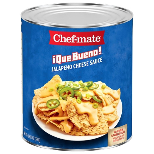 Chef-Mate Que Bueno! Jalapeo Cheese Sauce Is A Full-Flavored Cheddar Cheese Sauce With The Spicy Mexican Accent Of Real Jalapeno Peppers And Green Chilies. Use For Nachos, Burritos, Enchiladas, Tacos, Chili Bowls, Hot Dogs, Or Burgers. 0 Grams Trans Fat Per Serving. Made With Real Cheddar Cheese. No Artificial Flavors And No Artificial Colors (Colors From Natural Sources). Unlike Canned Competitors, Chef-Mate Products Are Cooked Before Canning Under Pressure To Prevent Scorching And Boiling, Preventing Tinny Or Canned Flavor. Packed In An Easy-To-Stack, Shelf Stable #10 Can. Ready To Eat. Superior Steam Table Holding Time Of 8 Hours. Refrigerate Unused Portions.