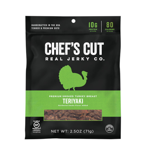 Chef s Cut Teriyaki Smoked Turkey Breast Jerky, 2.5 Ounce - 8 Per CaseThe Chefs Cut Teriyaki Smoked Turkey Breast Jerky is a good source of protein, making for a healthy snack option. It is gluten free, making it suitable for those with special dietary needs.Features: