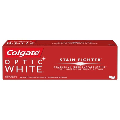 Colgate Optic White Stain Fighter Teeth Whitening 4.2 Oz Toothpaste removes 6X more surface stains with micro-polishing action*. It contains clinically proven technology to safely remove surface stains and also help prevent new stains from forming, so your teeth stay whiter longer. This whitening toothpaste is good for daily use, enamel safe, and the fluoride toothpaste formula provides protection against cavities. It has a clean mint flavor in paste form to help freshen your breath.