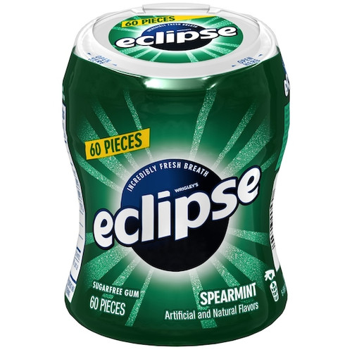 The Wrigley s Spearmint Big E Pack Eclipse Gum has a tasty and refreshing flavor. It is a good mouth freshener and contains no added sugar. The bulk case with 4 packs of Wrigley s Spearmint Big E Pack Eclipse Gum is ideal for supermarkets, retail stores, and candy stores.