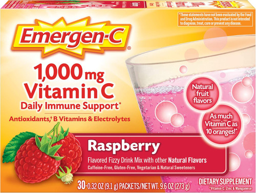 Emergen-C Raspberry Vitamin C Drink Mix offers a delicious and convenient way to support your immune system daily. Each packet delivers 1,000 mg of Vitamin C — more than 10 oranges* — along with B vitamins for natural energy, electrolytes, and essential antioxidants including zinc and manganese.