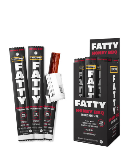 Just the right combo of savory and sweet, the FATTY 2oz Honey BBQ meat stick delivers saucy BBQ flavor in every bite. Packing 12g of high-quality protein, it’s a healthy snack you can rely on to fill you up and keep you moving. Perfect for mountain biking, skiing, or whenever you need some serious fuel, FATTYs are individually wrapped jerky snacks with whole ingredients like grass-fed beef, antibiotic-free pork and all-natural seasoning. Slow smoked with 100% real hickory wood and made with genuine honey BBQ sauce, it’s the go to BBQ meat stick for a mouthwatering taste with the perfect tender chew. And they’re American made without any BS, like gluten, nitrites, nitrates, MSG, artificial colors or flavors, making them the perfect snack for when you are craving serious BBQ flavor on the go.