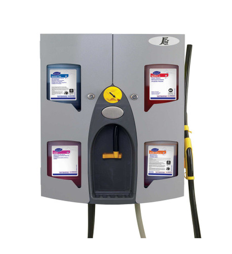 QuattroSelect dispensing system allows you to choose from our different products with the turn of a dial. Simply select the product you desire, choose one handed low flow bottle fill or point of use bucket activation and dispense ready-to-use solutions into spray bottle, buckets and automatic scrubbers. The lockable cabinet helps eliminate unwanted cartridge removal.