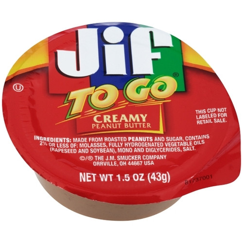 The Jif To Go Creamy Peanut Butter is a great dip for snacks. Prepared with roasted peanuts and sugar, it has a creamy texture. This ready-to-eat peanut butter comes in pre-portioned cups for portion control. It contains no trans fat, cholesterol, or gluten, and is a healthy option. Packaged in 1.5-ounce cups, this Jif To Go peanut butter bulk pack is suitable for school cafeterias, cafes, and retail stores.