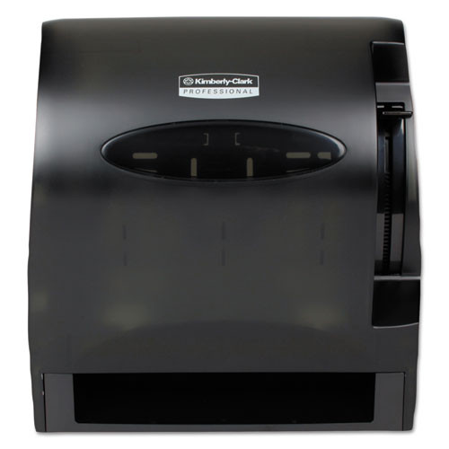 See-through smoked plastic design eliminates the need to open the dispenser to determine when a refill is needed. Easy lever operation. Durable high-impact plastic. Automatic feed enables one-handed loading.