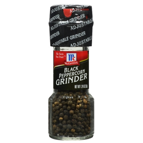 The McCormick Culinary Black Peppercorn Grinder delivers ground peppercorn that adds a pungent aroma and bold flavor to every dish. Grinding the pepper at the moment of use ensures timely release of essential oils that bring out maximum aroma and flavor. This peppercorn grinder also adds a stylish touch to any kitchen counter. Black peppercorns in a glass bottle with a built-in adjustable grinder. Great on chicken, beef, pork, vegetables and salads.