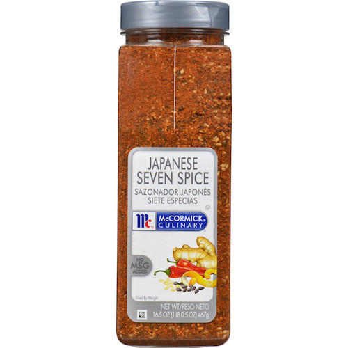 McCormick Culinary Japanese Seven Spice Seasoning (aka shichimi togarashi) explodes with umami-like flavor: -McCormick Culinary Japanese Seven Spice Seasoning blends seven distinctive spices including chilies, nori flakes, orange peel and sesame seed for a spicy, herbal-citrusy combination of flavors. -Blended especially for chefs, McCormick Culinary Japanese Seven Spice Seasoning offers an exceptional, labor-saving pre-blended option for chefs to easily create robust recipes with global appeal. -McCormick Culinary Japanese Seven Spice Seasoning is kosher with no MSG added. -Our global sourcing enables unparalleled control and understanding of our supply chain, ensuring every product delivers a pure and consistent flavor. -There are 6/16.5 oz. containers per case. Our 16.5 oz. size is perfect for back-of-house recipe customization. -McCormick Culinary Japanese Seven Spice Seasoning adds bold flavor and bright color to dips, dressings, broths, rice and grilled foods.- Seven spice seasoning