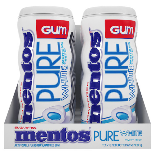 Keep your smile bright and breath fresh with Mentos Pure White Sweet Mint Sugar-Free Gum. This refreshing chewing gum helps reduce plaque and contains 35% fewer calories than regular sugared gum. Each resealable flip-top pack includes 15 pieces, ideal for on-the-go freshness.