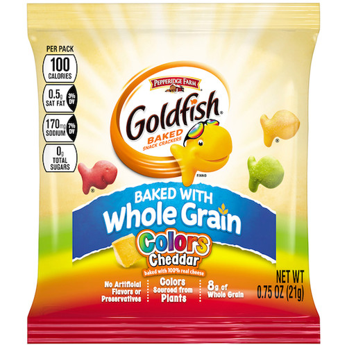 - Baked colorful goldfish crackers made with whole grains and real cheddar cheese