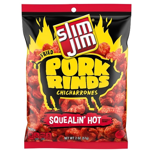 The Slim Jim Squealin Hot Fried Pork Rinds are a crispy and delicious snack. It has a spicy and bold flavor. These pork rinds are USDA-inspected and free from trans fat, making it a healthy choice. With 12 bags, the bulk case is a great buy for cafeterias, vending machines, and supermarkets. A growling stomach is actually a squeal for Slim Jim Pork Rinds Fried Snacks. Enjoy big, bold, in-your-face flavor when you crunch into a bag of Slim Jim Squealin Hot Pork Rinds. These pork cracklins have less than 1 gram total carbs per serving, making them bona fide low-carb lifestyle snack with a kick. 2-ounce bags of Slim Jim Chicharrones are delicious, spicy snacks you can munch on at the rodeo or while wrestling a greased pig, or take them to go for hot road trip snacks. Stock up on these snacks to keep your appetite from crying wee wee wee all the way home.