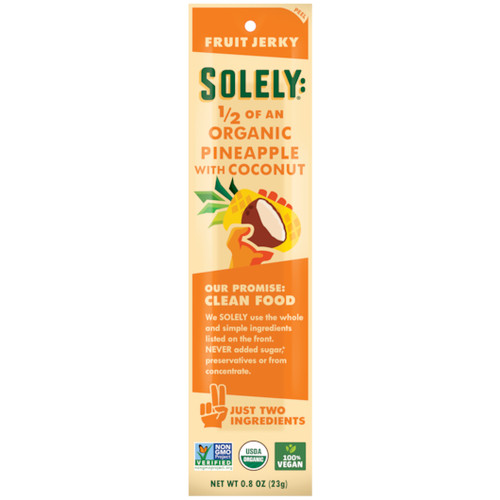 Two ingredient, organic fruit jerky. Made from one half of a cold pressed pineapple with coconut. No added sugar or preservatives, just ripe fruit. Certified Organic, Non GMO, Kosher, and Paleo Friendly.
