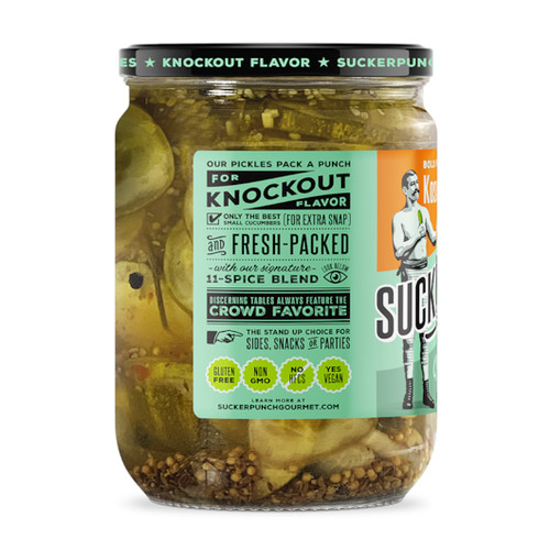 Punch up your pickle game with Suckerpunch Gourmet Kosher Dill Pickle Chips. Made with fresh cucumbers, clean, pronounceable ingredients, and a bold signature spice blend, these pickle chips deliver serious crunch and flavor. Each 24 fl oz jar is packed with crispy, tangy slices that are perfect for snacking, sandwiches, burgers, and more.