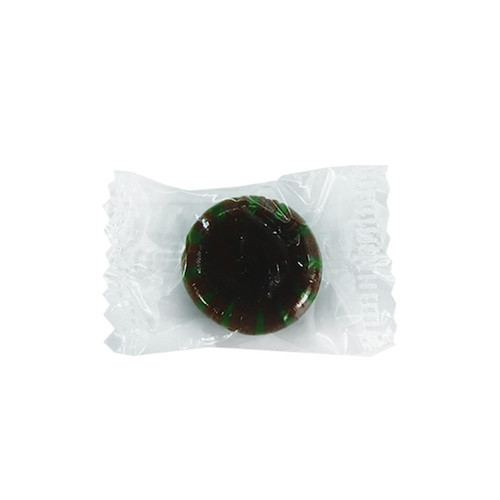 Individually Wrapped Fresh, Smooth Chocolate And Mint Flavored Hard Candy Containing 12 Green Stripes On A Brown Center.