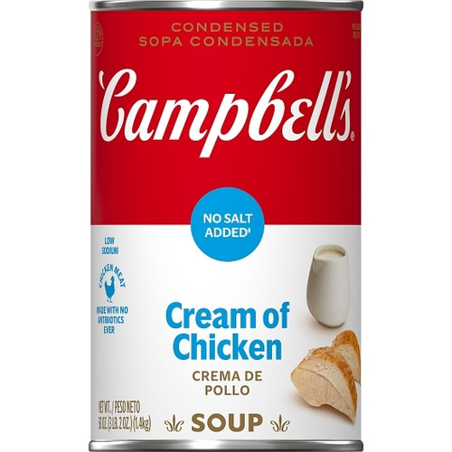 The epitome of comfort food, Campbell s 50 oz. can of cream of chicken condensed soup boasts a rich broth base made with real cream and rich chicken stock. It s speckled with soft pieces of savory chicken for hearty taste and features a smooth consistency. Its familiar flavor will be a popular addition to the menu of your school, health care facility, restaurant, hotel, or diner!