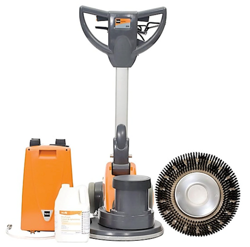 Maintain a professional appearance with minimal foot traffic interruption using this complete carpet-care system. An ergonomically formed grip with an adjustable handle height enables comfortable use and control, while a glide plate protects carpeting and increases efficiency by reducing drag. Foam brushes in size of 17 inches provide versatility for optimal results in a range of locations, and the dry foam generator dispenses varying amounts to meet specific needs. The dry foam formula deep cleans carpets and dries within 30 minutes to reduce disruptions in the workplace. The low-speed of this TASKI carpet-care system keeps vibrations and noise levels low for a safe, comfortable environment.