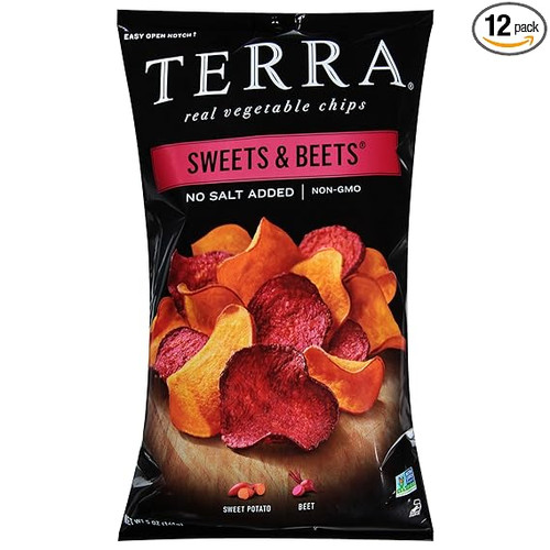 Terra Sweets & Beets Vegetable Chips – No Salt Added – 5 oz Bags, 12-Pack Case – Vegan, Gluten-Free, Non-GMO, Kosher Enjoy a naturally sweet, vibrant snack with Terra Sweets & Beets Chips. Made from real slices of sweet potato and beet, these no-salt-added vegetable chips deliver crisp texture and clean ingredients with zero artificial flavors or preservatives. A colorful, better-for-you snack option that’s both gluten-free and vegan. -  Made with Real Sweet Potatoes & Beets – No salt added