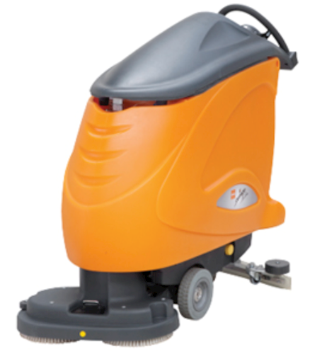 Walk-behind 22 inch (55 cm) auto scrubber, ideally sized for performance, features offset brushes for superior cleaning along walls and under racks.