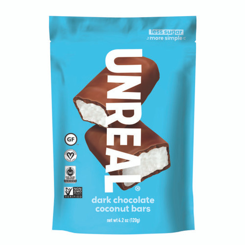 Indulge guilt-free with Unreal Brands Dark Chocolate Coconut Bars. Each bar combines rich, smooth dark chocolate with shredded organic coconut for a delicious, satisfying treat. Perfect as a snack or dessert, these bars contain only 3 grams of sugar and no artificial sweeteners — ideal for health-conscious shoppers seeking better-for-you options.