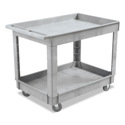 Durable resin construction, gray, two-shelf utility cart with casters. Molded-in plastic handle allows for easy steering on the go. The handle and raised top rim are great for hanging cleaning products and supplies to tackle cleaning jobs from one room to the next.