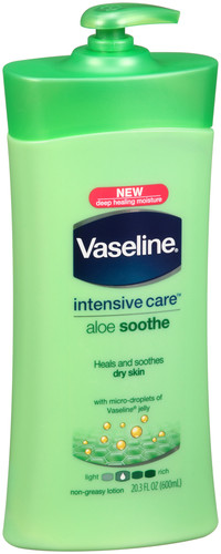 The Vaseline Intensive Care Aloe Soothe Body Lotion is formulated with 100% pure aloe vera extract. It refreshes and restores dry skin without making it greasy.