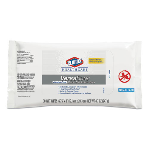 Clorox® Healthcare VersaSure Cleaner Disinfectant Wipes kill microorganisms quickly on a broad range of surfaces. These strong and durable alcohol-free wipes are a one-step solution to cleaning and disinfecting. VersaSure™ wipes are EPA-registered to kill pathogens on hard surfaces in as fast as 30 seconds for most bacteria and viruses. Designed for patient and staff comfort, these wipes are formulated with no harsh chemical odors, fumes, or added fragrances. Intended for use in commercial settings.