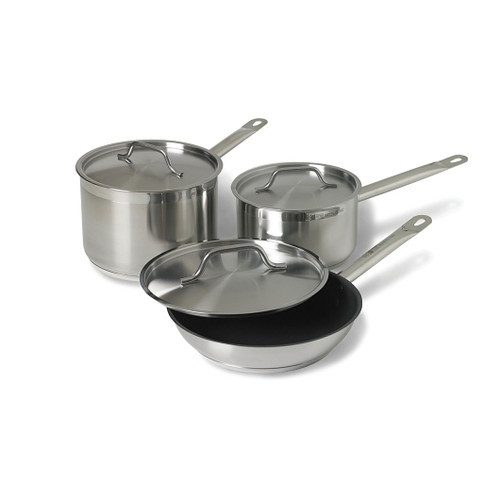 The Vollrath Optio Deluxe 6-Piece Cookware Set offers a versatile and durable collection designed to meet the needs of professional chefs and serious home cooks alike. Crafted from high-quality stainless steel, this set resists discoloration and corrosion, ensuring long-lasting performance and preventing flavor retention for superior cooking results.Induction-ready with a natural finish, each piece in this set delivers even heating and consistent cooking. The cookware features strong welded handles with convenient hang-holes for easy storage and a secure grip.